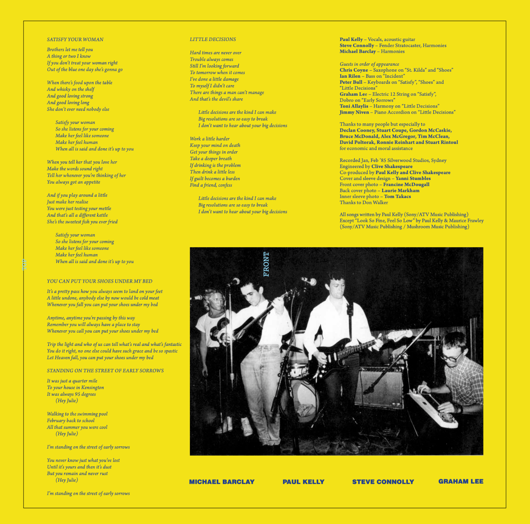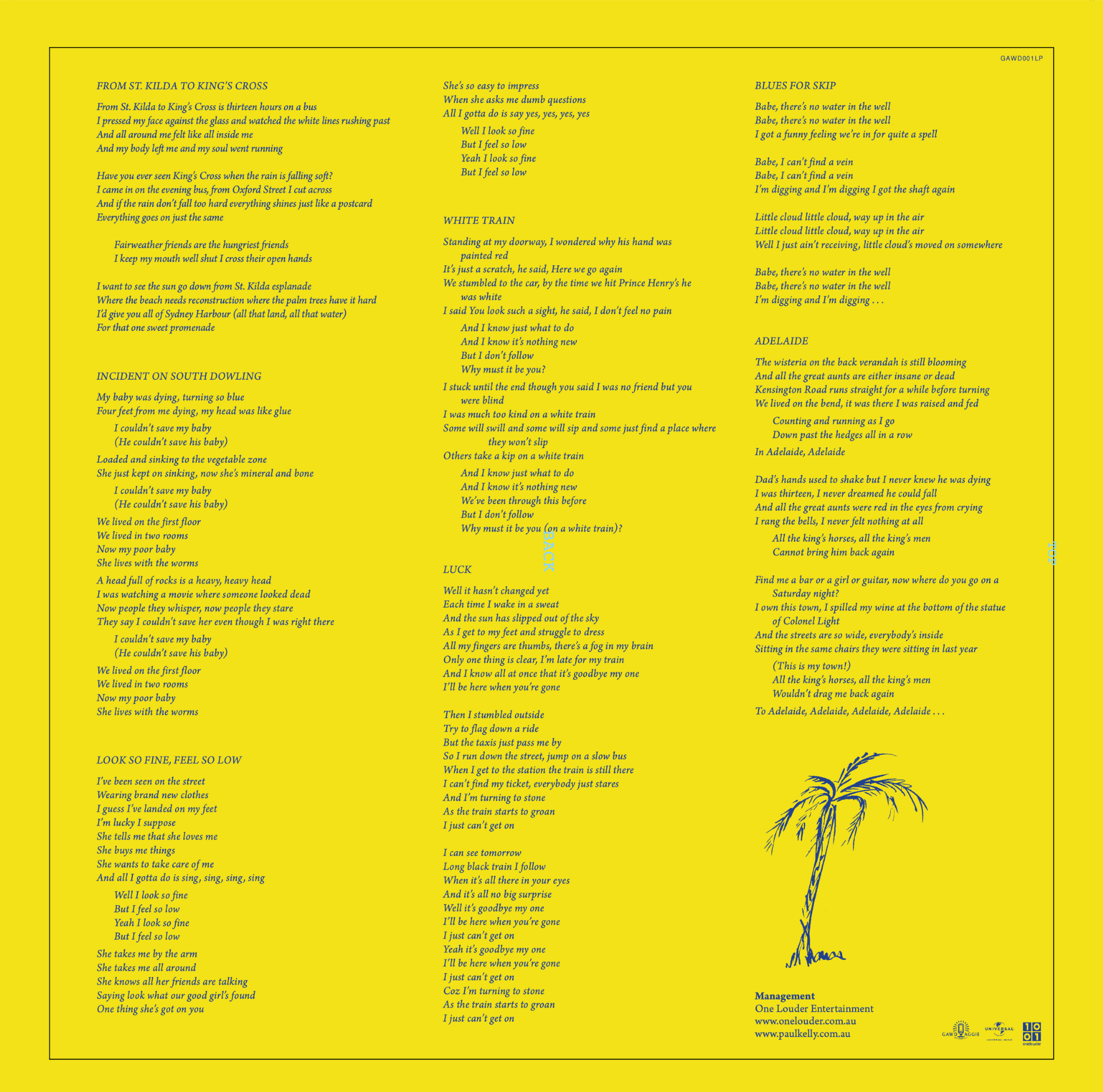 Post Post on SpotifyPost on Apple Music Satisfy Your Woman You Can Put Your Shoes Under My Bed Standing On The Street Of Early Sorrows Little Decisions From St. Kilda to King’s Cross Incident on South Dowling Look So Fine, Feel So Low White Train Luck Blues For Skip Adelaide